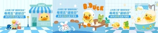 同时,抖音生活服务与经典高热IP B.DUCK小黄鸭联动,当小黄鸭成为「周五遛娃大使」,直接萌化你的心,来「遛娃好去处」,既能和小黄鸭一起享受买买买的亲子快乐时光,也能体验到亲子洗浴的治愈温暖,更有小黄鸭陪你在温馨酒店安稳入睡。